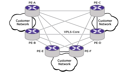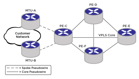 The first figure below shows fault-tolerant access in a full mesh core VPLS network while the second figure shows fault-tolerant access in a hierarchical VPLS network.