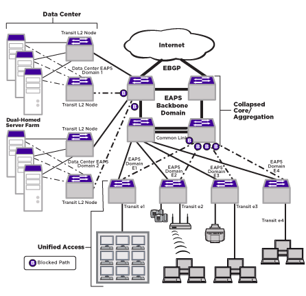 In the network core, EAPS is used with OSPF to provide a high-performance IP routing backbone with zero downtime or route flaps. Using EAPS and dual-homed server farms in the data center provides high availability for mission-critical server resources.