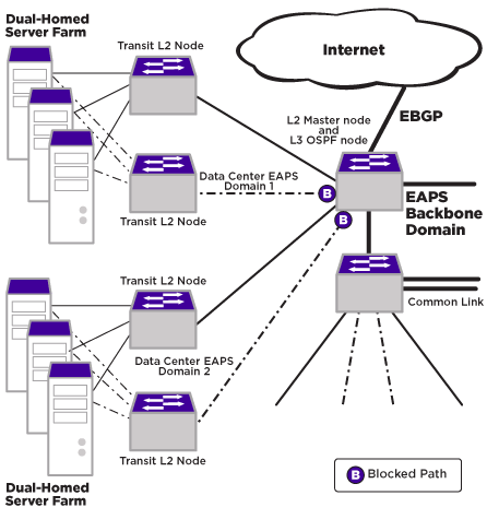 The core switches provide high performance backbone routing between the data center and the rest of the network, which includes both internal and external (Internet) destinations. The core switch acts as the EAPS master node for each ring, while the data center switches act as EAPS transit nodes to complete the ring. The core switch also acts as the OSPF routing node to provide gateway routing functionality to the server-farms. For an additional level of resiliency, each server is dual-homed (dual attached) to both EAPS transit L2 switches. Even if a switch or link fails, the servers are available.