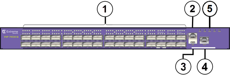 The following figure illustrates the components on the front panel of the VSP 7432CQ. Slot 1 is used for all of the ports.