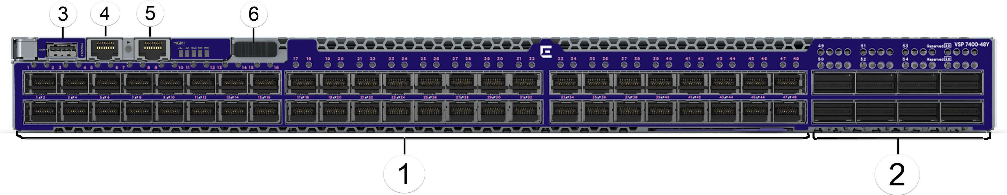 The following figure illustrates the components on the front panel of the VSP 7400-48Y. Slot 1 is used for all of the ports.