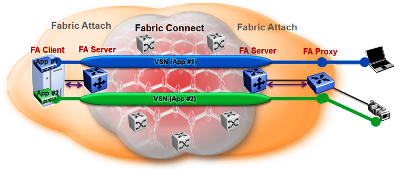 In an FA solution, the FA Server performs the role of connecting FA Clients and FA Proxies to the SPB fabric, with minimal configuration. As part of the discovery handshake between the FA Server and client or proxy devices, LLDP PDUs are exchanged. Using standard LLDP, the FA Server learns neighbors, that include the proxy and client devices. In addition, the FA Server transmits organizational-specific element-discovery TLVs that are used by the client or proxy device to recognize its attachment to the FA Server.