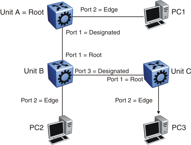 Unit A configures port 1 to the forwarding state, and Unit B configures port 1 to the forwarding state. PC 1 and PC 2 can now communicate. The negotiation process now moves on to Unit B port 3 and its partner port. PC 3 cannot exchange data with either PC 1 or PC 2 until the negotiation process between Unit B and Unit C finishes.