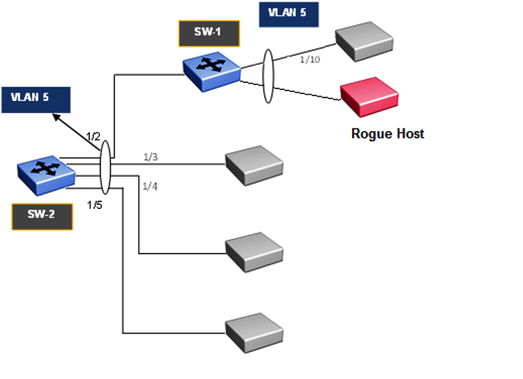 In the following topology, Layer 2 switch SW-1 is connected to another Layer 2 switch SW-2. SW-2 is connected to three hosts and SW-1 is connected to two hosts.