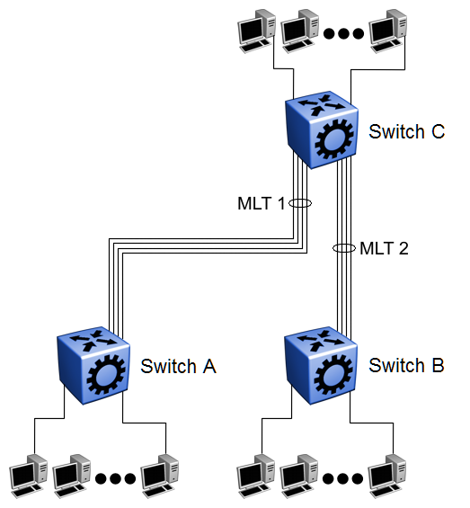 The following illustration shows two multilink trunks (MLT1 and MLT2) connecting three switches.