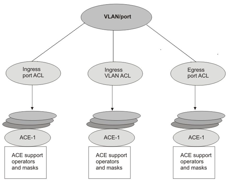 The following figure shows the relationships between ACEs and VLAN- and port-based ACLs.