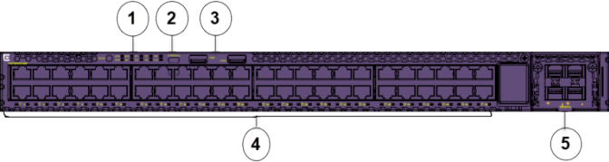 One USB micro B console port. An alternative RJ-45 console port is provided on the back panel (not shown).