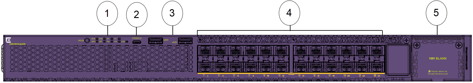 The following diagram illustrates the components on the front panel of the VSP4900-24XE switch. Slot 1 is used for the 24 fixed ports and slot 2 is used for Versatile Interface Module (VIM) ports, if a VIM is installed in the VIM slot.