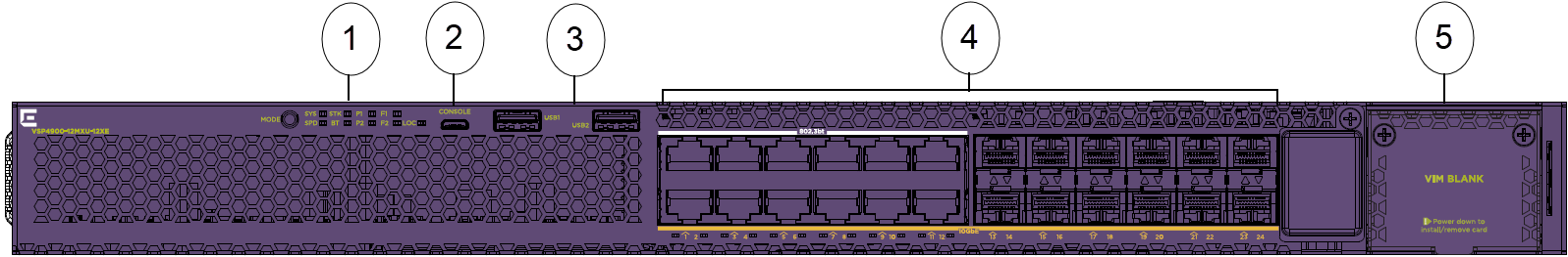 The following diagram illustrates the components on the front panel of the VSP4900-12MXU-12XE switch. Slot 1 is used for the 24 fixed ports and slot 2 is used for Versatile Interface Module (VIM) ports, if a VIM is installed in the VIM slot.