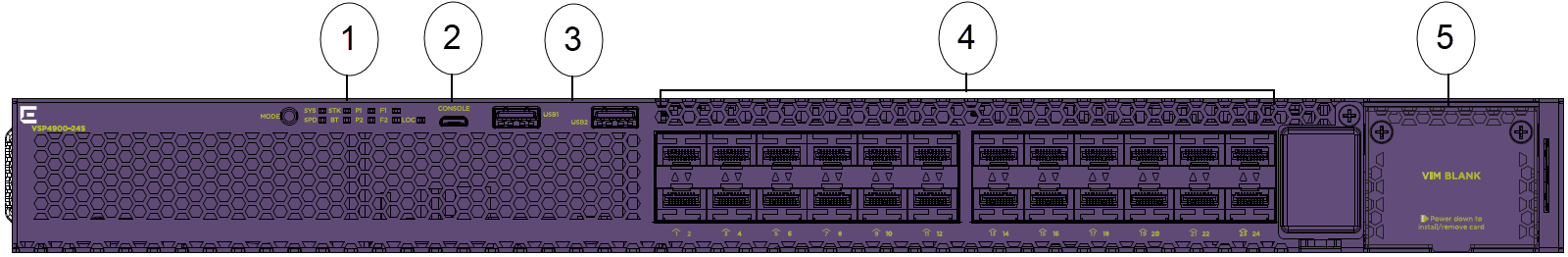 The following diagram illustrates the components on the front panel of the VSP4900-24S switch. Slot 1 is used for the 24 fixed ports and slot 2 is used for Versatile Interface Module (VIM) ports, if a VIM is installed in the VIM slot.