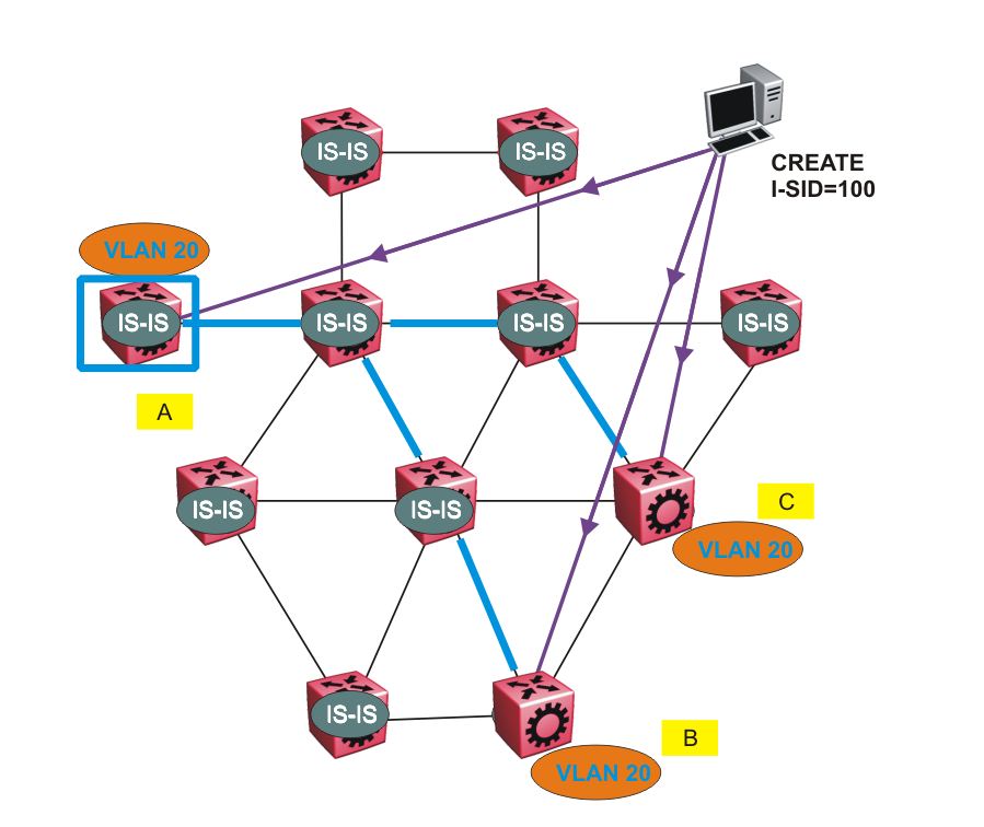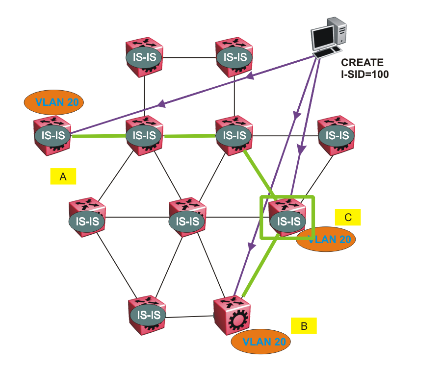 BMAC and I-SID information is flooded throughout the network to announce new I-SID memberships. In this case, VLAN 20 is mapped to I-SID 100.