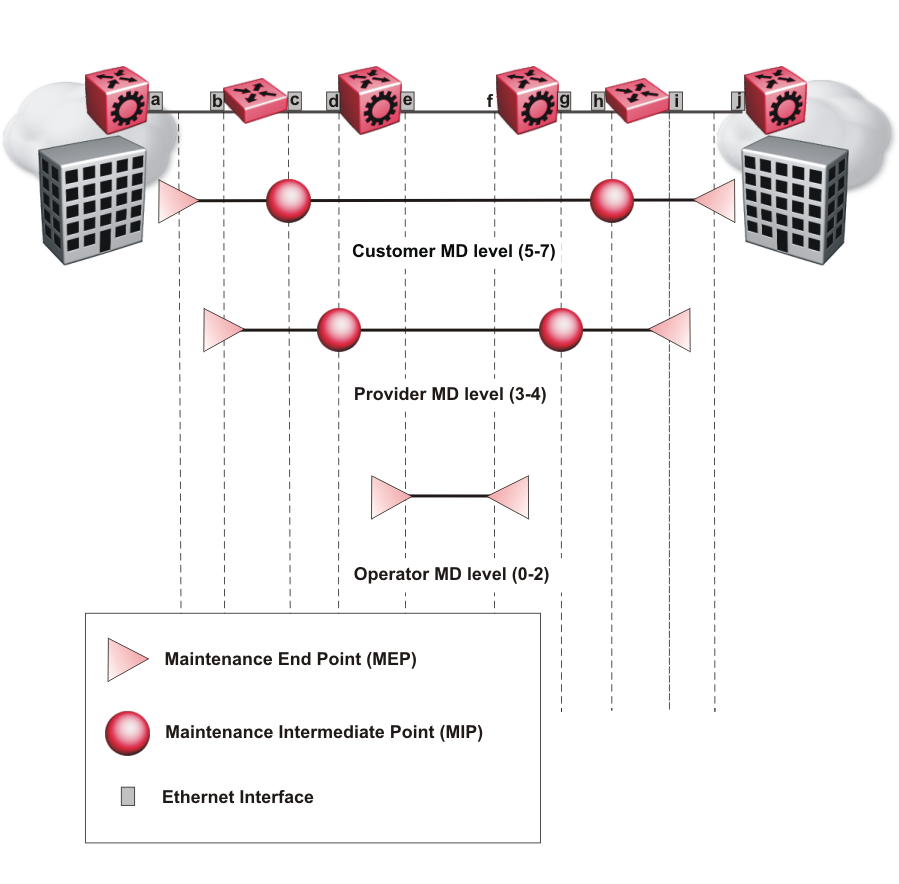 The following figure shows MD level assignment in accordance with the 802.1ag standard. As shown in the figure, MIPs can be associated with MEPs. However, MIPs can also function independently of MEPs.