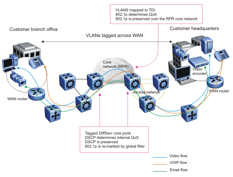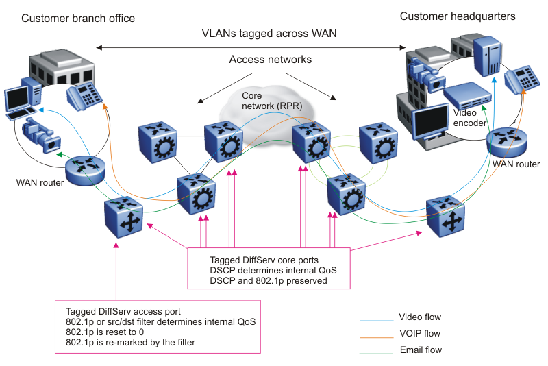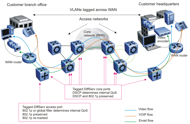 The following figure illustrates the actions performed on three different bridged traffic flows (that is VoIP, video conference, and email) at access and core ports throughout the network.