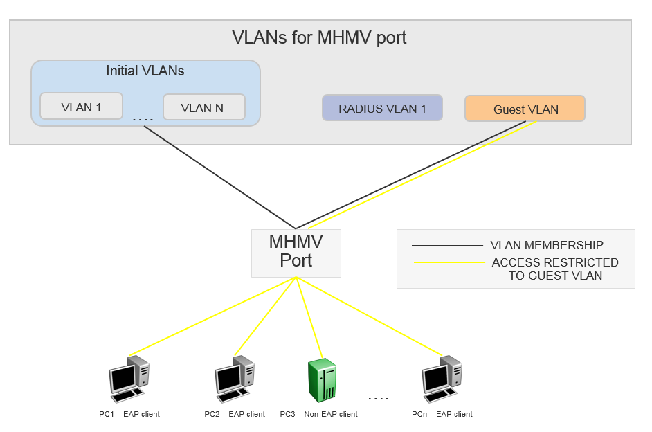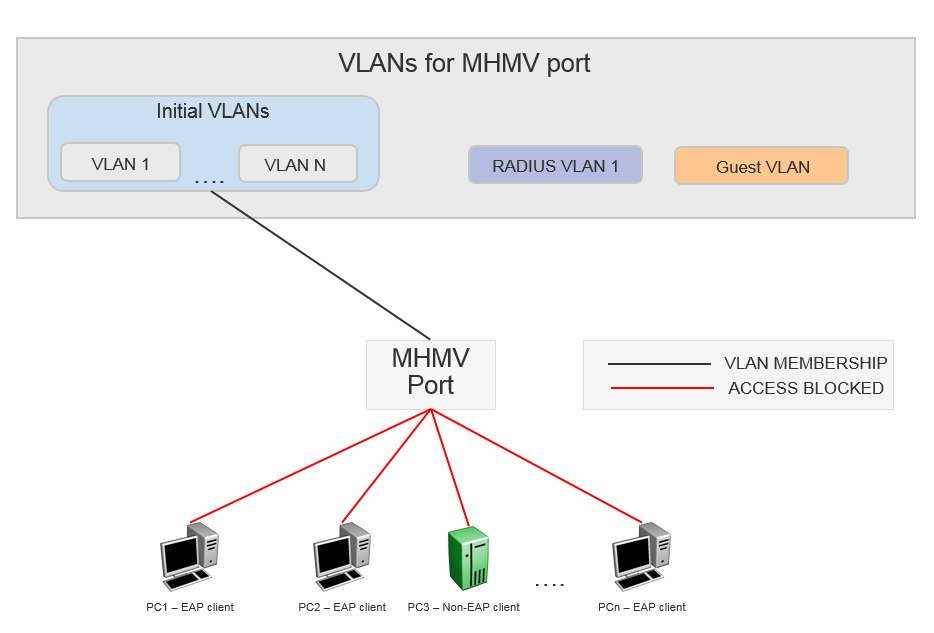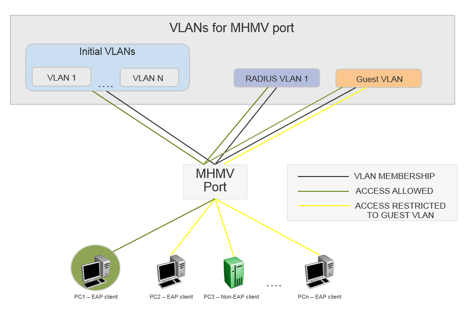 The MHMV port is in the initial VLAN stage but gets added to the Guest VLAN ID. The default VLAN ID is updates to correspond to the Guest VLAN ID.