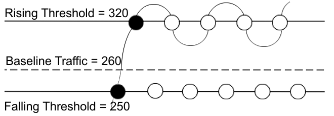 You can define one threshold value to an expected, baseline value, and then define the opposite threshold as the out-of-bounds limit. Because of sample averaging, the value is equal to ±1 baseline unit. For example, assume you define an alarm with octets leaving a port as the variable. The intent of the alarm is to notify you if excessive traffic occurs on that port. You enable spanning tree, and then 52 octets transmit from the port every 2 seconds, which is equivalent to baseline traffic of 260 octets every 10 seconds. This alarm notifies you if you define the lower limit of exiting octets at 260 and you define the upper limit at 320 (or at any value greater than 260 + 52 = 312).