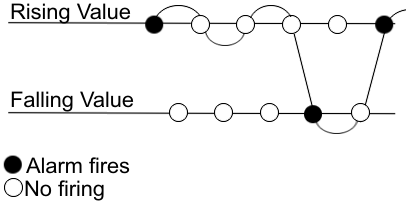 The alarm fires during the first interval that the sample goes out of range. No additional events generate for that threshold until the system crosses the opposite threshold. Therefore, you must carefully define the rising and falling threshold values for alarms. Incorrect thresholds cause an alarm to fire at every alarm interval, or never at all.