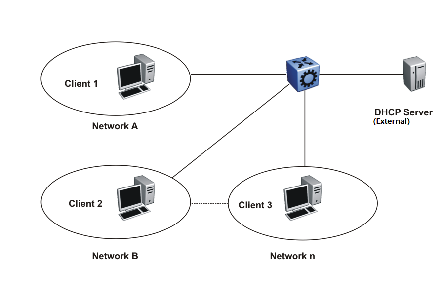 The DHCP option 82 is added at the DHCP relay level as shown in the following image, which illustrates the architecture. This example illustrates an external DHCP server. However, the option is also supported if you are deploying a hosted DHCP Server.