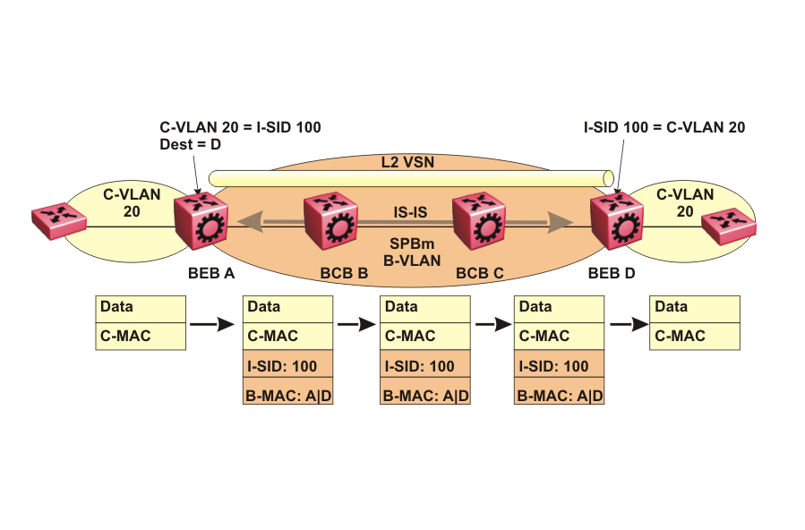 At BEB D, the node strips off the BMAC encapsulation, and performs a lookup to determine the destination for traffic with I-SID 100. BEB D identifies the destination on the C-VLAN header as C-VLAN 20 and forwards the packet to the appropriate destination VLAN and port.
