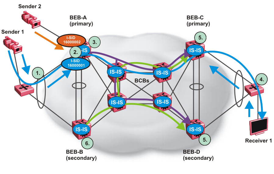 For the non-SMLT attached sender 2, the stream is hashed to the primary or secondary B-VLAN based on whether the data I-SID is even or odd numbered. For the SMLT attached to sender 1, IS-IS advertises the stream to the rest of the fabric on the primary B-VLAN and synchronizes information to the vIST peer.