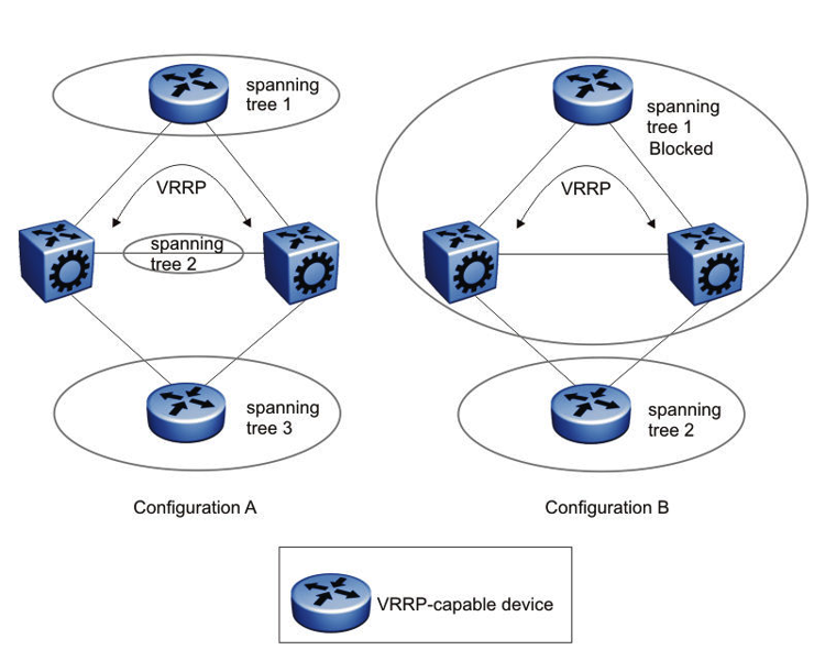 The following figure shows two possible configurations of VRRP and spanning tree; configuration A is optimal and configuration B is not.