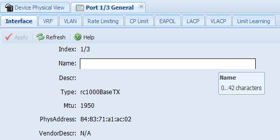 The following figure is a sample that shows the content pane for the Port 1/3 General, Interface tab. If you want to compare the information in two tabs, you can undock one, then open another tab. For more information about undocking a tab, see Undock and dock tabs.