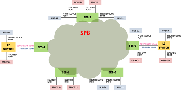 Transport within the SPBM network is achieved by associating the private VLAN with an I-SID. Flooded traffic from both promiscuous and isolated devices is transported over the same I-SID multicast tree and suppression for spoke-to-spoke traffic is done on the egress SPB Backbone Edge Bridge (BEB). This means the Private VLAN IDs are globally significant and must be the same on all BEBs.