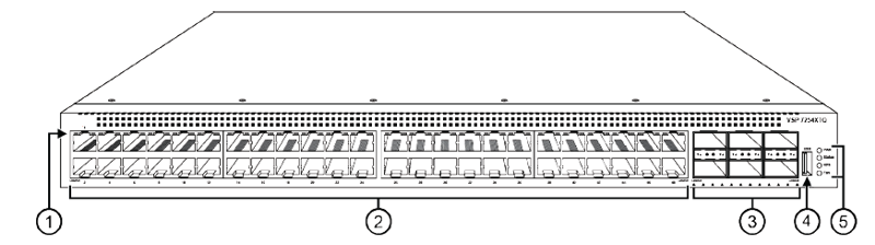 48 ports — The VSP 7254XSQ has 48 SFP/SFP+ fiber ports. The VSP 7254XTQ has 48 RJ-45 copper ports.