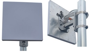 The AIO-TQ06120-N antenna is a vertical panel antenna. It measures 250 mm x 250 mm x 25 mm (9.84 inches x 9.84 inches x .98 inches) and weighs 0.8 kg (1.76 lbs). It ships with a mounting bracket.