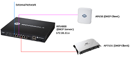 On the external network, the wireless controller is assigned an IP address of 192.168.10.188. The wireless controller acts as a DHCP server for the wireless clients connecting to it, and assigns IP addresses in the range of 172.16.11.11 to 172.16.11.200. The rest of IPs in the range are reserved for devices requiring static IP addresses.