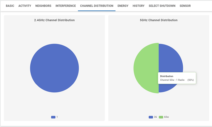 Use the data provided in the Channel Distribution tab to determine how RF domain member devices are utilizing different channels to optimally support connected devices and avoid congestion and interference with neighboring devices. Use this data to assess whether the channel spectrum is being effectively utilized and whether channel changes are warranted to improve RF domain member device performance.