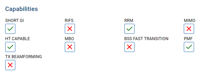 | AMPDU Size | Displays the maximum size of AMPDU (in bytes). AMPDU is a set of Ethernet frames addressed to the same destination wrapped in an 802.11n MAC header. AMPDUs are used in noisy environments to provide reliable packet transmission. |