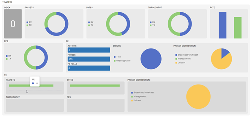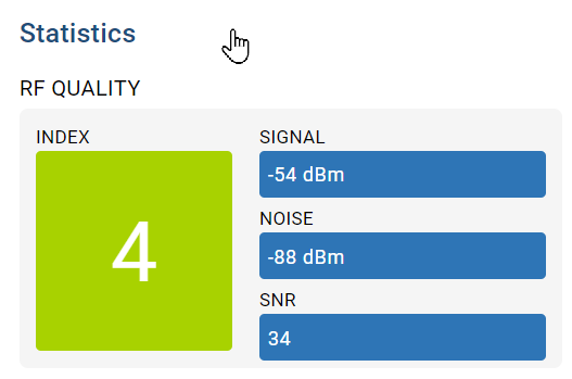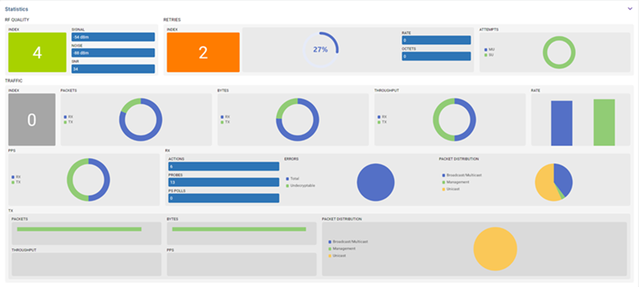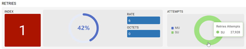 | Index | Displays the average number of retries per packet (and a performance indicator). A high Index number indicates possible network or hardware problems. Assess the error rate with respect to potentially high signal and SNR values to determine whether the error rate coincides with a noisy signal. |