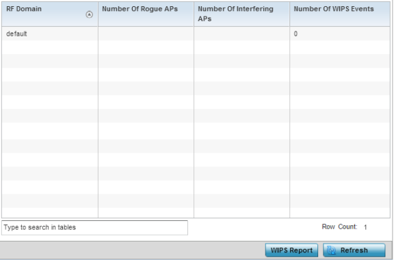 The WIPS Summary screen lists RF Domains residing in the system and reports the number of unauthorized and interfering devices contributing to the potential poor performance of the RF Domain‘s network traffic. Additionally, the number of WIPS events reported by each RF Domain is also listed to help an administrator better mitigate risks to the network.