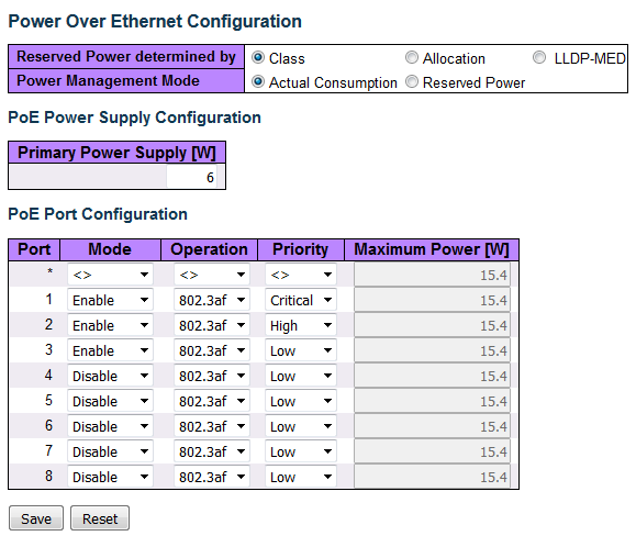If system budget is not enough for all PoE devices, the port with higher priority port will get power first. The last priority port (Port 3) will not be powered.