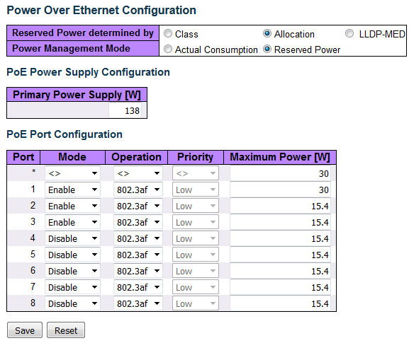 Primary Power Supply: 138 W (> all port reserved power)