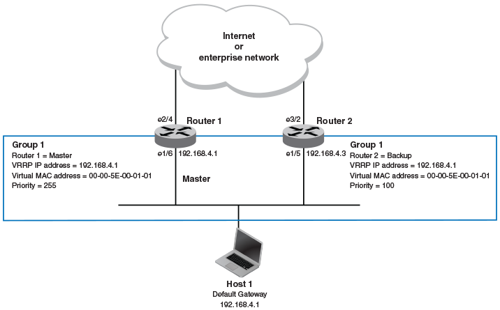 Devices configured as VRRP virtual routers for redundant network access for Host 1