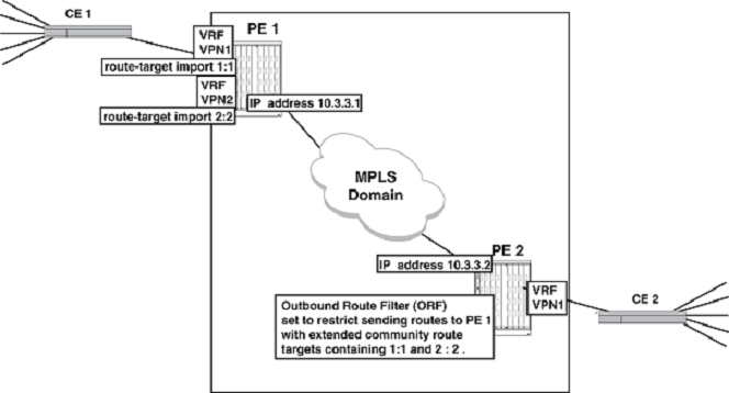 The Cooperative Route Filtering feature allows the user to move the filtering function of a route-target import filter to a peer. In this situation, an Outbound Route Filter (ORF) is derived from the contents of all of the route-target import commands of BGP configured VRFs on a PE and shared with a peer PE. This ORF is then used to exclude any routes that are blocked by that ORF from being sent by the peer PE to the PE with the route-target import commands from which the ORF was derived. For example, in the diagram below the routes that are admitted into VPN1 and VPN2 have route targets of 1:1 and 2:2. The user can use the cooperative route filtering feature to send an ORF that is derived from the route-target import commands on PE 1 to PE 2 to only accept these routes.
