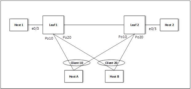 with Client 10 and 20, respectively. They are connected to Leaf1 and Leaf2 through