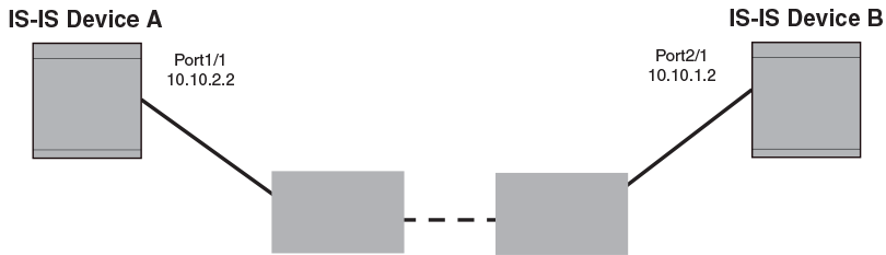 When IS-IS Point-to-Point over Ethernet is used, devices that are several hops away or available through an IP GRE tunnel can form an IS-IS adjacency. IS-IS Point-to-Point over Ethernet can also be used when only two IS‘s are part of the broadcast network. IS-IS Point-to-Point over Ethernet is configured at the interface level of the devices that are forming an adjacency.The figure below shows two devices several hops away from each other that are configured for IS-IS adjacency.
