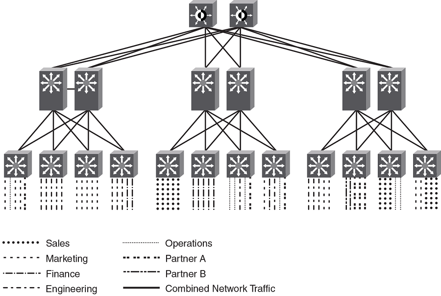 Multi-VRF deployments provide the flexibility to maintain multiple virtual routers, which are segregated for each VRF instance. The following illustrates a generic, high-level topology where different enterprise functions are assigned unique VRF instances.