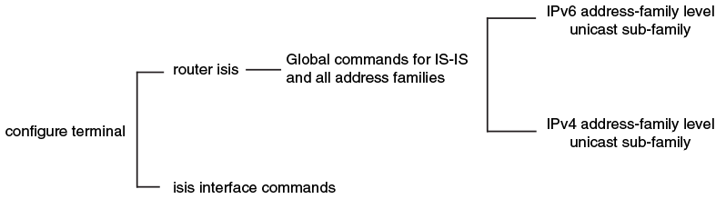 The CLI includes various levels of commands for IS-IS. The figure below illustrates these levels.
