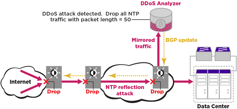 BGP flowspec can be applied to DDoS attack filtering. Traditional methods of filtering DDoS attacks include advertising a black hole route to the destination under attack and advertising the destination under attack with a special community that sets the nexthop to a discard nexthop. The disadvantages of traditional approaches include a lack of granularity and the mixing of routing and filtering information. BGP flowspec facilitates a more granular approach to DDoS attack filtering, allowing you to propagate policies that filter and police DDoS attacks in a service-provider environment where mitigation points may be in different autonomous systems.