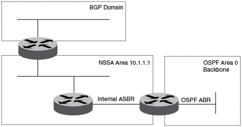 This example shows two routing domains, a BGP domain and an OSPF domain. The ASBR inside the NSSA imports external routes from BGP into the NSSA as type 7 LSAs, which the ASBR floods throughout the NSSA.