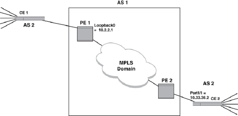 In the example shown in the diagram below the service providers network is in AS1 and the customer wants both of his CE routers at different sites to use AS 2. When a route is sent from CE 1 to CE 2, it contains an AS_PATH attribute containing AS 2. When CE 2 sees that the AS_PATH attribute contains its own AS number, it rejects the route.