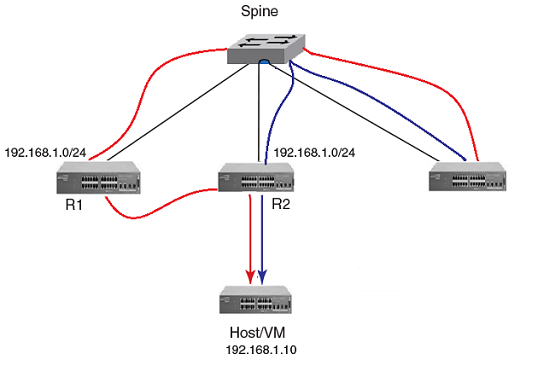 In the following figure, traffic towards Host/VM is load balanced by R3 across R1–R2 ECMP paths (the same next-hop but with different router-MAC addresses). However, the same traffic gets load balanced again by Spine across R1 and R2. Because of the underlay load balancing, Layer 3 traffic with the router-MAC of R2 may land on R1 and conversely. Because the destination MAC after VxLAN tunnel termination belongs to the MCT peer, traffic is Layer 2-switched to the MCT peer and is then routed there. This causes traffic tromboning.