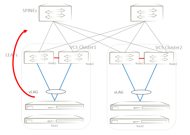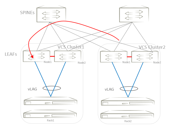 Node1 in VCS Cluster1 is reloading. The vLAG between Node1 and Node2 is not formed yet, but the BGP session between leaf and spine nodes is established. Servers could start load balancing the traffic to Node1, but that traffic is black holed as the vLAG is not formed yet.