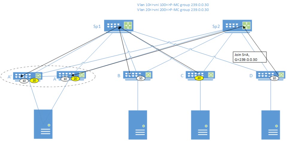 The following figure shows an example of multi-homed configuration. The server attached to A supports a LAG connection to A/A‘ which forms an MCT cluster. The join for the core MDT coming from the spines are directed at the logical VTEP address for the A/A‘ cluster, so that any particular join from a spine can land at either switch. Also, when LVTEP/MCT cluster joins the IP Fabric MDT, the PIM-SSM Join is initiated only by the MCT Peer node which is elected as Primary MDT node.