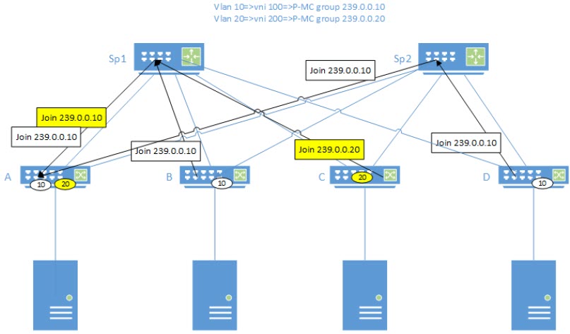 VNIs can be configured to core multicast group address relationship for multicast traffic. In this example, two different group addresses are configured for the two VNIs. PIM creates two source specific trees routed at A, one for each group address.