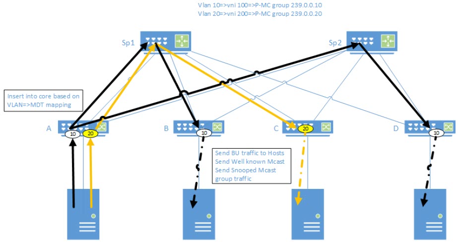 The following figure shows an example of per VNI MDT datapath. The multicast traffic is forwarded within the core based on the MDT group that corresponds to the VLAN and VNI which were signaled with PIM. Traffic for vlan 20 follows a different path than traffic for vlan 10.