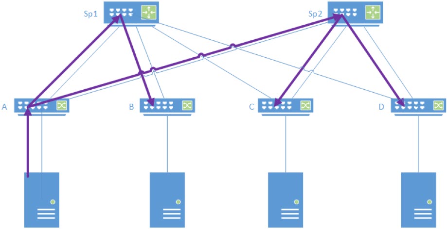 BUM traffic at entry node is sent over the vxLAN tunnel for the default MDT, reaching all nodes. The traffic is dropped at egress as required. The topology in which a single spine is utilized is also possible. This depends on where the protocol messages or PIM Join to establish the tree are transmitted.